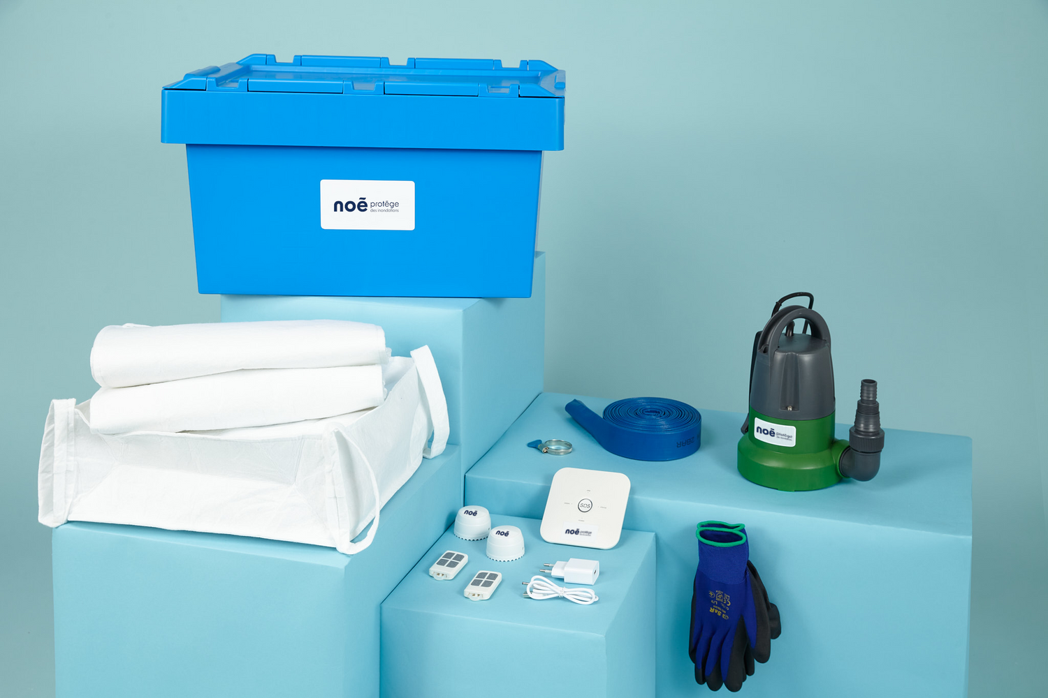 Différents Kits composés de : Sac anti inondation + Détecteur d'eau + Service d'Alerte Météo (1 an) + Pompe vide cave (dans Big noé et Noé)